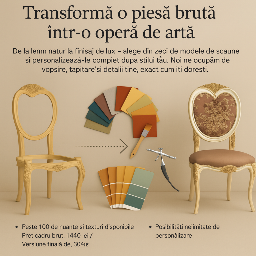 De la lemn natur la finisaj de lux – alege din zeci de modele de scaune și personalizează-le complet după stilul tău. Noi ne ocupăm de vopsele, tapițare și detalii fine, exact cum îți dorești.
